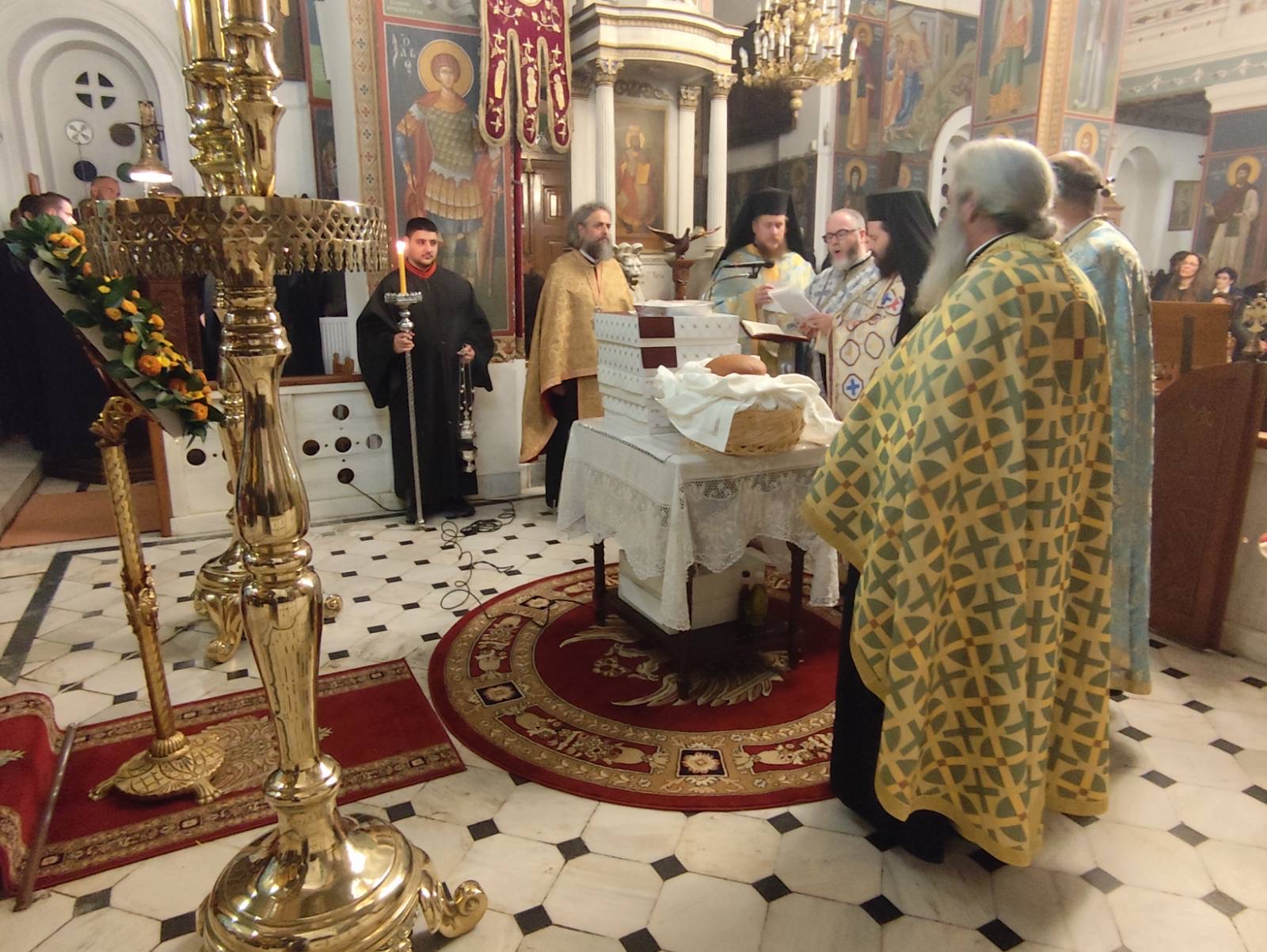 Στον πολυιερατικό Μέγα Πανηγυρικό Εσπερινό, την παραμονή της εορτής του Αγίου, και στην Αρχιερατική Θεία Λειτουργία, ιερουργούντος του Σεβ. Μητροπολίτη Ειρηνουπόλεως κ.κ. Νικάνδρου, τέθηκε προς προσκύνηση τεμάχιο του Ιερού Λειψάνου του Αγίου, προς ενίσχυση του χριστεπώνυμου πληρώματος. Μετά το πέρας της Θείας Λειτουργίας, πραγματοποιήθηκε λειτανία της Ιεράς εικόνας και του Ιερού Λειψάνου του Αγίου, προς ευλογία ολόκληρης της πόλης της Καρύστου.