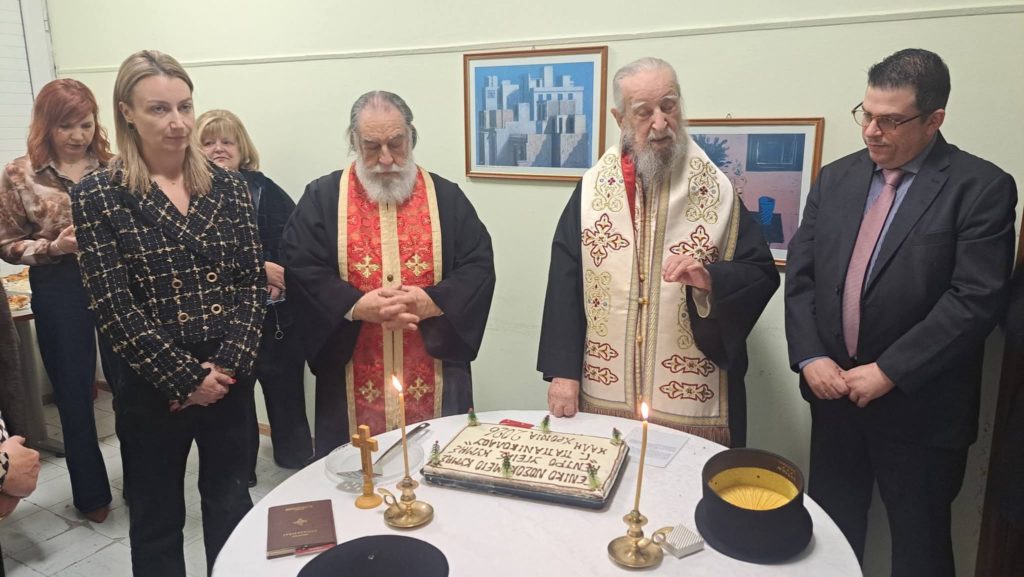 Μετά το πέρας του Εσπερινού, στην αίθουσα του πνευματικού κέντρου του Ιερού Ναού, ο Σεβασμιώτατος Μητροπολίτης κ.κ. Σεραφείμ ευλόγησε την Αγιοβασιλειόπιτα και ευχήθηκε προς τους συμμετέχοντες.