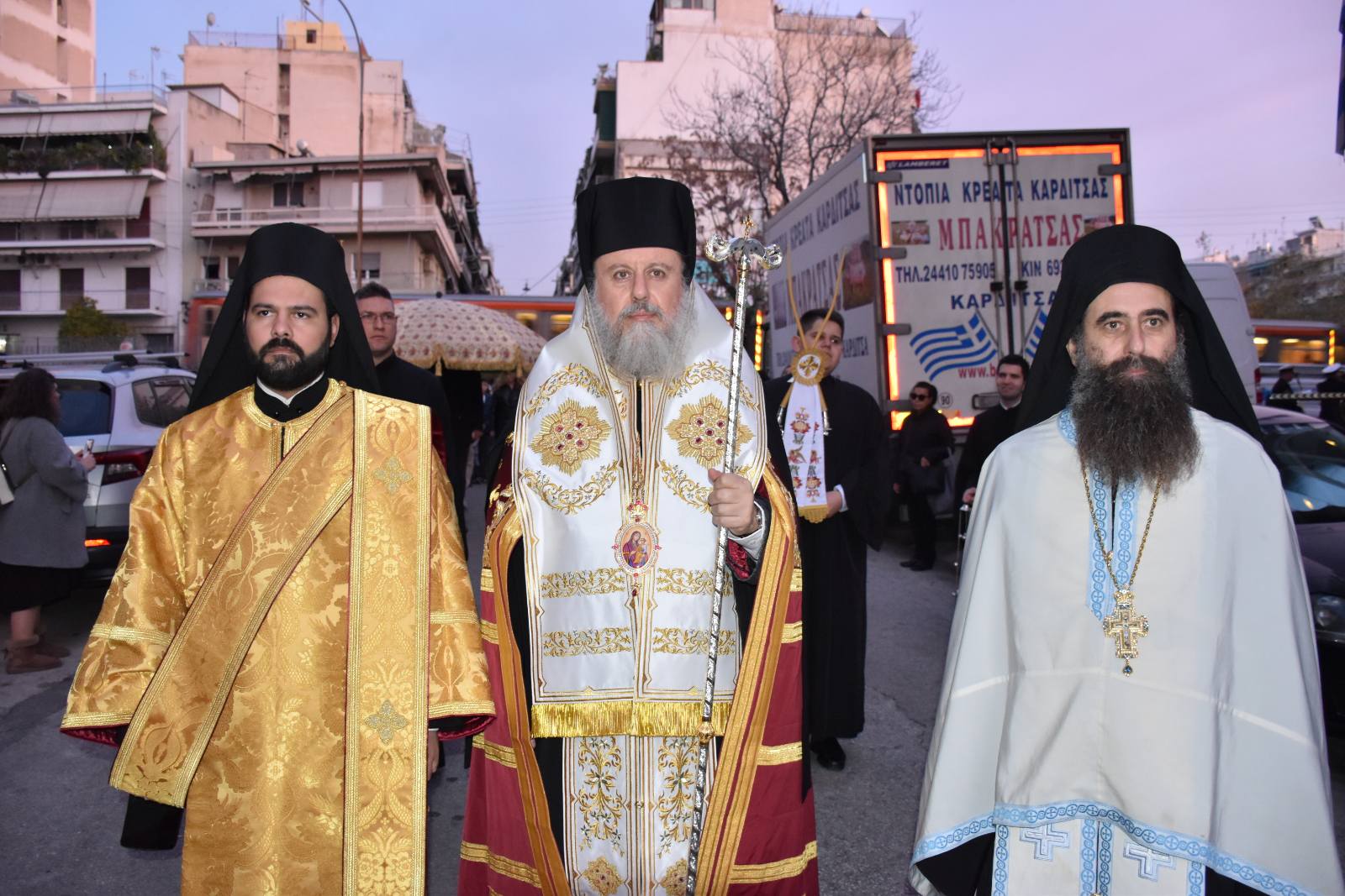 Σας ευχαριστούμε που φέρατε την Μητέρα του Κυρίου κοντά μας. Η Παναγία να σας το ανταποδώσει. Μέσα από αυτή την παρουσία παίρνουμε θάρρος, νιώθουμε χαρά, νιώθουμε δοξολογία και παίρνουμε κουράγιο να συνεχίσουμε με πίστη προς τον Θεό και στα ιερά και στα όσια του ορθοδόξου Γένους. Παίρνοντας αυτή την χαρά, εκ μέρους του μακαριωτάτου Αρχιεπισκόπου μας επευλογούμε την ευλογία και ευχόμαστε σκέπη, προστασία και ελπίδα στη ζωή του καθενός και της καθεμιάς».